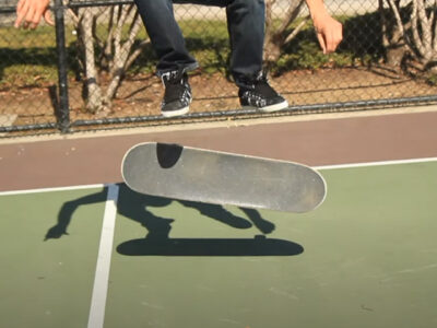 360(スリーシックスティー)キックフリップは、キックフリップの回転にさらに縦の1回転を加えた回しトリック。