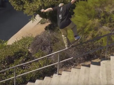 軽くテール側へデッキを傾け、遊びができたノーズを使ってノーリーのように跳ねて降りるイメージだ。